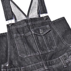 These denim overalls have adjustable shoulder straps, chest and back patch pockets, side button closures, and side slant pockets.