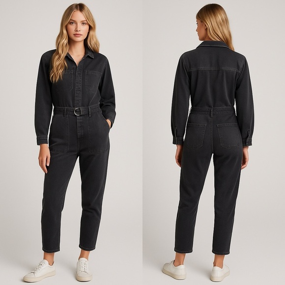 AG Ryleigh jumpsuit, AG utility denim jumpsuit, Adriano Goldschmied jumpsuit, black denim one-piece, designer jumpsuit women, AG jeans coverall, minimalist street style, NWT AG jumpsuit, casual luxury outfit.
