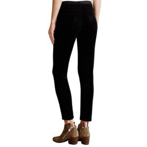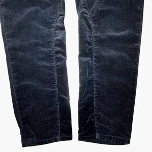 These mid rise slim straight ankle pants are a combination of dark black velvet at the waistband and inner calf inset and black corduroy. There are patch back pockets and faux slant front pockets. In excellent used condition.