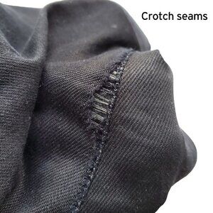 Crotch seam in one area is parting and other crotch seam shows wear.