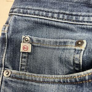 AG Adriano Goldschmied The Graduate Jeans in blue denim are designed for men in a size 38 with a 34" inseam. They feature a classic 5-pocket design with a coin pocket, and are made of a cotton/polyurethane blend denim fabric. Dark wash, belt loops, AG logo. The style is tailored and slimming, suitable for all seasons. Made in the United States, and are machine washable. Light wear- can be seen on back pocket.