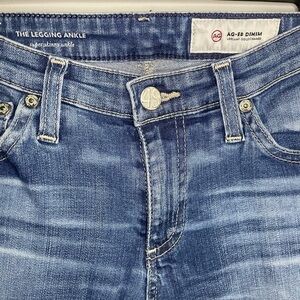 These AG denim skinny jeans are a perfect addition to your closet. They are casually distressed and have a few holes.