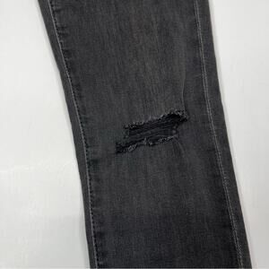 Gray or faded black distressed "The Legging" jeans from AG Adriano Goldschmied. Super skinny ankle fit and made with a soft denim. Mid rise and fitted through hips and thighs with a skinny leg. Light distressing including a hole in the left knee area - please see photos. Classic 5 pocket design. Button and zipper waist closure.