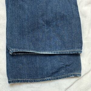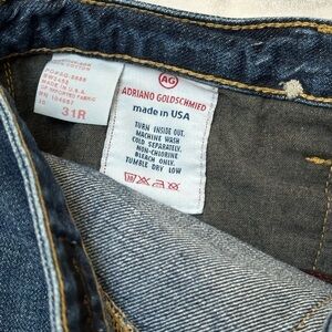 Adriano Goldschmied. The jeans are made with 10 oz Regal Denim, which is 98% cotton and 2% polyurethane. They have a higher curved back, a 20” flared leg opening, and a proprietary slide snap front fastening. The jeans also have signature Adriano Goldschmeid stitching on the back pockets and slight whiskering on the front pockets.
