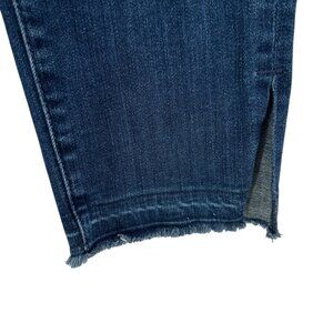 AG Adriano Goldschmied Mid-Rise Stevie Capri Slim Straight - AG Style #: GNR 1781-SL-SID - 5-pocket style dark distressed denim wash slim straight cropped capris jeans. Button & zipper closure. Raw hem at the leg opens with slits on the sides. Material has a stretch. Cotton Blend. Made in the USA.