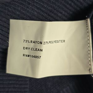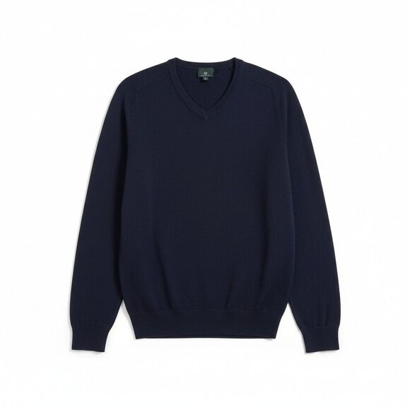 This Men's Medium AG Adriano Goldschmied navy V-neck sweater features a fine-gauge knit with ribbed neckline, cuffs, and hem, plus textured mesh side panels for subtle structure. The silhouette is straight with full-length sleeves and a smooth, lightweight hand feel. Fabric content is a rayon-polyester blend.