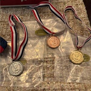 Retired American Girl Team USA Olympic Medal Ceremony Set. This set includes a windbreaker style red, white and blue jacket, a flag, and medals in gold, silver and bronze to be awarded to your favorite 18 inch American girl doll. The gold medal has a tiny bit of tarnish on it. See last photo.