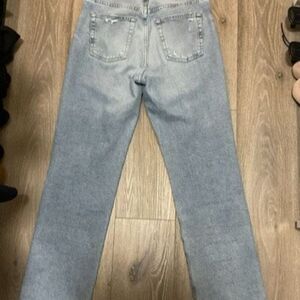 Super different and chic slightly distressed, high-rise relaxed, straight leg jeans in color Summer Solstice. Bottom hem is frayed and and in the front cut into a V - elongates the leg! Excellent condition.
