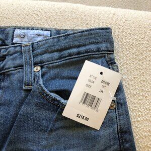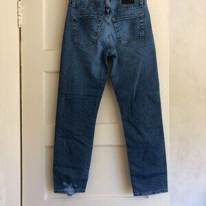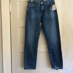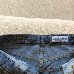 AG says, "Our Ex-Boyfriend Slim has a slouchy mid-rise silhouette with slim legs and fraying hems. These relaxed-fit women's jeans come in 11.75 oz. Vintage Comfort Stretch Denim from Italy and feature a medium indigo stonewash with a 14-year AG-ed™ finish. The pair is faded and whiskered for the look of vintage jeans—complete with a bit of distressing at the pocket area. Vintage Comfort Stretch Denim, 11.75 oz. 98% Cotton, 2% Elastane"