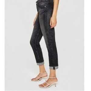 Nearly new AG Adriano Goldschmead ex boyfriend slouchy slim jeans in roadway black. Ex-Boyfriend Slim Jean features a medium denim wash that’s been uniquely washed down and faded to mimic a genuine pair of vintage jeans. The Ex-Boyfriend is cut with a flattering high-rise waist, and fits slouchy and relaxed from hip to knee before slightly tapering at the leg opening for a slimming effect.