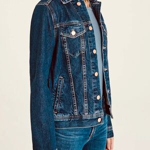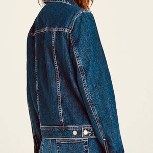 The Mya Jacket is a classic jean jacket for women featuring a vintage midblue denim wash with subtle fading and highs and lows at seams. Mya offers an easy silhouette for seasonal layering and essential side slit pockets. This women’s denim jacket is designed in a midweight Japanese denim fabric spun with 100% cotton for a classicly structured look and feel.