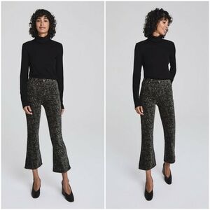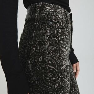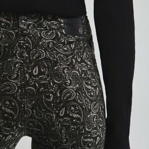 Black and white paisley print, fitted silhouette through the hips, straight fit through the thighs, and is finished with a dramatic cropped flare break at the knee that finishes in an ankle-length crop. Lightweight velvet fabric with added super stretch.