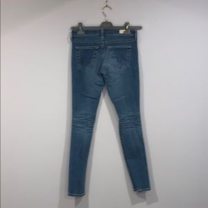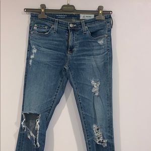 Mid rise “legging ankle” with distressing. Rips have grown from brand new but look better that way. Good condition.