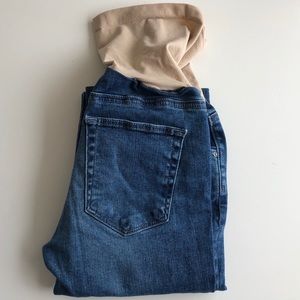 These medium wash cropped maternity jeans by AG are perfect for warmer weather. Jeans feature cropped bootcut legs with raw edge hem in plain weave denim and nude belly panel to grow with your bump.