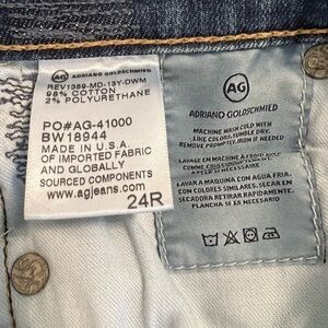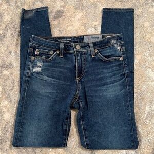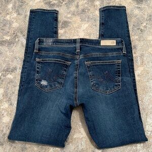 AG The Legging Ankle Jean in 13 Years Dawn Mended. Size: 24. Premium designer jeans combine a timeless silhouette with cool, lived-in edge. Crafted in a soft, stretchy denim with a medium wash and subtle fading with intentional factory distressing and mended knee patches that add effortless character. The legging style skinny fit hugs your curves and hits right at the ankle - perfect for showing off sneakers, heels, or boots. Features: medium wash denim with fading, factory-intentional distressing, patched knee holes, super skinny ankle fit, zip fly with button closure. 98% cotton, 2% polyurethane. Excellent condition, like new