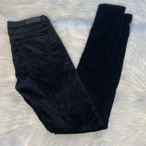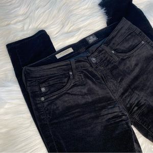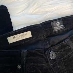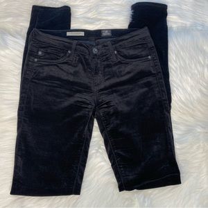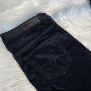 These are AG jeans - Adriano Goldschmied. They are black velvet. They are a low to mid rise. They are a size 25R. On a flat lay, these measurements are approx: waist is 13.5” and the inseam is 30.5”. Please ask for any other measurements.