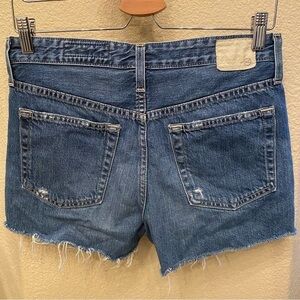 Pre-owned in great condition with no stains. Women’s blue The Sadie high-rise ripped raw hem jean shorts. No stretch. Comes from smoke and pet free home.