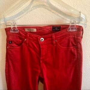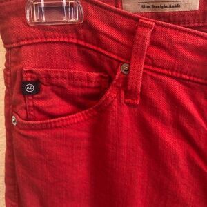 AG red/orange Stevie ankle slim straight jeans. These jeans are so well made and fitted. Wish i could keep them but they are too small on me now. They look great with boots! EUC. Non smoking home. Feel free to ask any questions