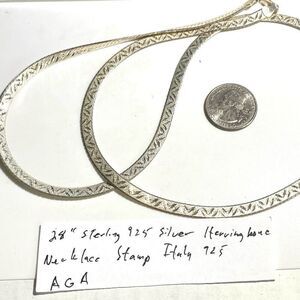 AGA# Beautiful Sterling 925 Silver 28” herringbone vintage necklace. We work hard to find high quality fine jewelry for our buyers. This item is sourced from an estate sale and the former owner had exquisite tastes. The great craftsmanship make this item a true work of art and with its pristine condition It is truly A great value of fine jewelry at costume pricing! Let’s make it yours!