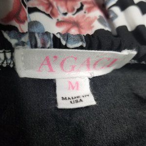 A’Gaci Off The Shoulder sleeveless soft flowy semi sheer top. Its beautiful banded neckline is designed with black & white stripes and pink flowers.