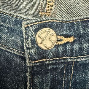 Approximate measurements: Waist flat across front 15-1/4”, rise 7-1/2”, inseam 25”, leg opening flat 5-1/2”. Ideal for casual outings or dressing up, these preowned jeans are a sustainable fashion choice.