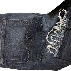 Features: High Rise, button zip closure, back pockets, frayed hemline