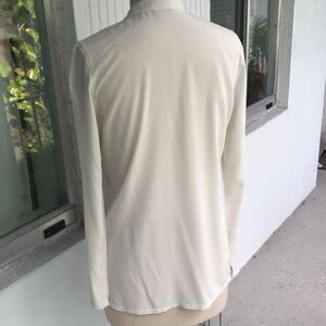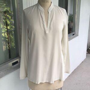 This is a super nice silk top with a little bit of spandex. Dress it up or dress it down. Color is a soft white