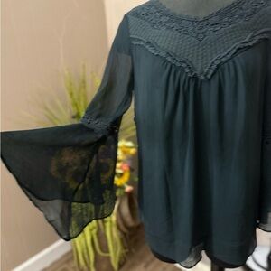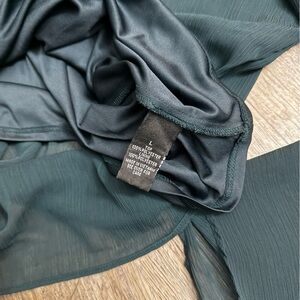 In excellent condition. No issues. Size large. Bodice is lined, sleeves are sheer. Color is a very dark blueish green.