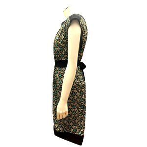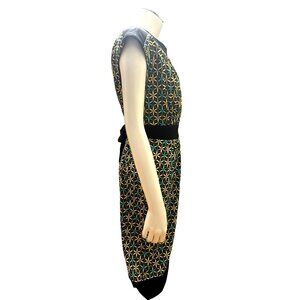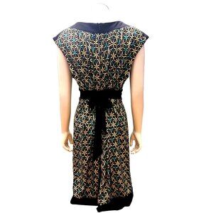 This AGB dress embodies a sophisticated urban vibe with its geometric print in black and gold. Ideal for city outings, it offers a classic silhouette enhanced by a flattering waist tie. The dress pairs seamlessly with heels or boots, making it a versatile addition to your wardrobe.