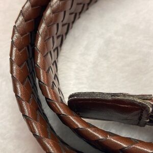 AGB belt: 53” length, just over 1” width. Brown leather braided.