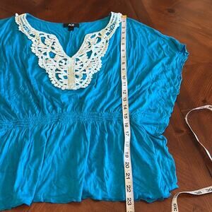 Peacock blue soft knit top with white lace appliqué, elastic waist