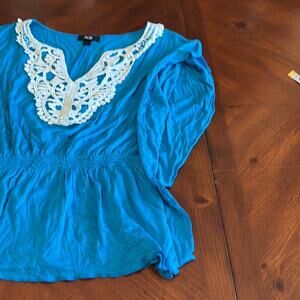 AGB Size S Peacock Blue Knit Top with White Lace Appliqué Elastic Waist
