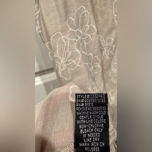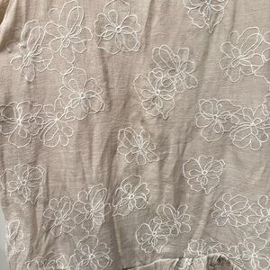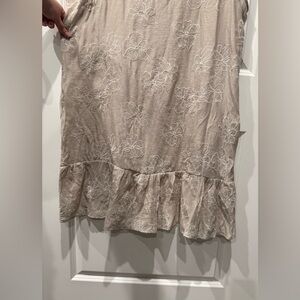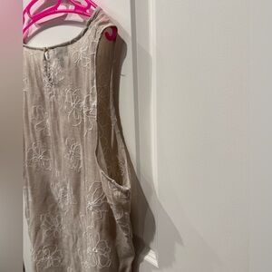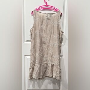 AGB Woman Sleeveless Gauze Flounce Hem Dress, Size XL, Beige with White Embroidered Flowers. Beachy Boho Chic Linen-Look.
