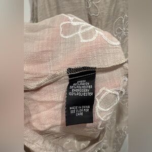 - Designed in a linen-look textured fabric (62% Rayon, 38% Polyester) with embroidered detailing (100% Polyester) that channels coastal boho, cottagecore, & vacation-core vibes