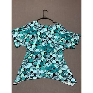 AGB Women’s V-Neck Floral Top Blue Black Print Asymmetric 1X (no size tag, see measurements)