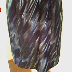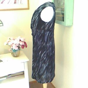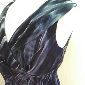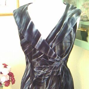 This velvet dress has the appearance of marled silver and black. Very soft and comfortable, a little stretchy. Wrap front with pleats and a seam under the chest. Rolled collar. Fully lined. Side zip. Size 12 measures 42 at chest, 36 at waist, 42 at hips, 39 long from shoulder to hem. A gorgeous dress for your special occasion.