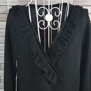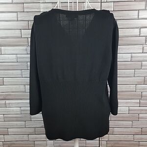 Acrylic spandex blend slightly stretchy knit sweater. Ruffled v-neck, 3/4 sleeves and a long ribbed knit hemline. Good pre-owned condition. Showing signs of normal wash and wear.