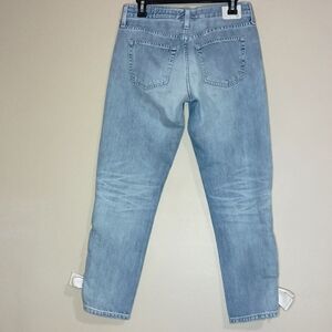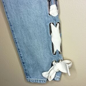 AG-ED Adriano Goldschmied Ex Boyfriend Slouchy Slim Lace Up Leg Ankle Jeans in 100% Cotton. Light Wash Ankle Jeans with Cream Color Tie on the Side of the Legs. Excellent Like New Condition.