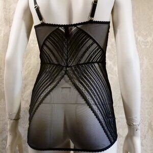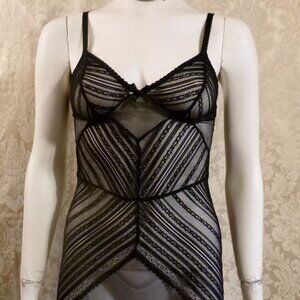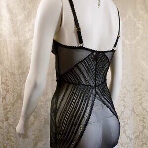 This cheeky mini-slip is from "The Esma Collection" - a formfitting L'Agent by Agent Provocateur sheer black slip composed of delicate stretch mesh and patterned linear & floral lace. Scalloped trim accents the covered elastic edges; the hemline grabs just below the buttocks. Adjustable straps. The slip has some flexible stretch/give which creates a superb body-fitting silhouette.