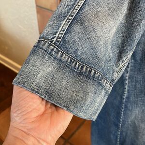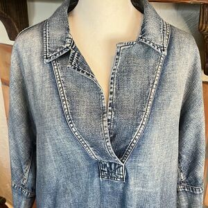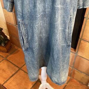 Carefully craft the perfect warm-weather look in this AG® Adriano Goldschmied Amanda Dress. Oversized chambray shift dress boasts rolled cuffs at the short sleeves and an overall faded look for an effortlessly laid-back aesthetic. Spread collar. Front welt pockets. Straight hemline with split side seams.