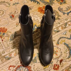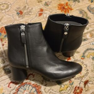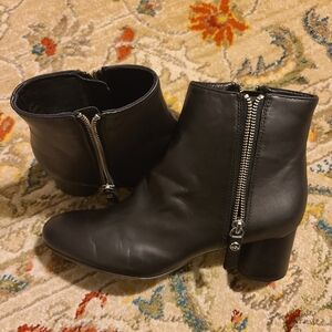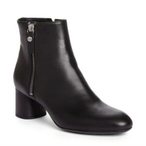 A flared cylindrical heel adds intriguing detail to this double-zip bootie crafted in Italy of smooth leather and grounded on a flexible rubber sole. 2" heel 5 1/2" shaft Dual side zip closures Leather upper and lining/rubber sole Made in Italy