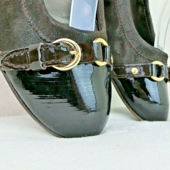 These AGL ballet flats are brown leather with a patent leather cap toe design. Gold tone hardware. Side walls marked D 558034.