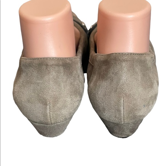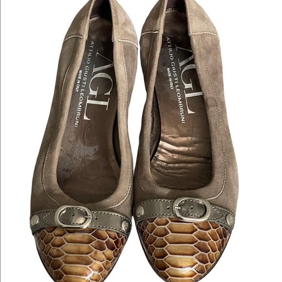 Attilio Giusti Leombruni. Light brown tan suede and snakeskin embossed patent leather cap toe wedges. Silvertone buckle detail across the top. Slip on style. Rounded toes. 1.25” wedge heels.