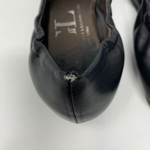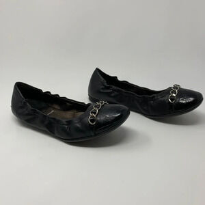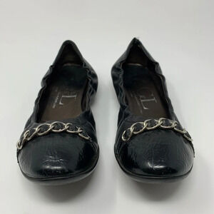 AGL Attilio Giusti Leombruni Chain Flats in Black. A polished metal chain crosses the glossy patent toe of a lush suede flat shaped with a partially elasticized topline for a perfectly lovely fit. Leather. Made in Italy.