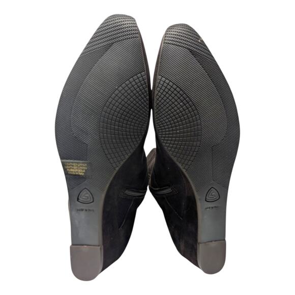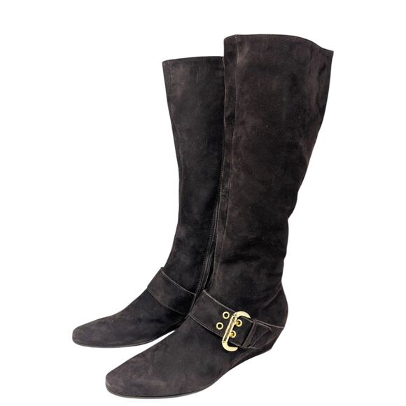 Luxurious Italian-made boots by Attilio Giusti Leombruni (AGL). Crafted in rich black suede with a sleek silhouette, soft leather lining, and an elegant gold buckle detail. The hidden wedge heel adds lift while keeping them comfortable enough for all-day wear.