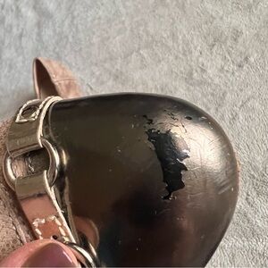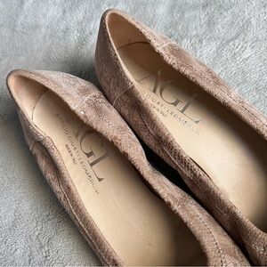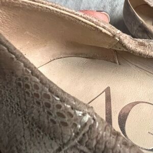 Good used condition. Jody Ballet Wedge by AGL Attilio Giusti Leombruni in cream with tan and gold-tone detailing and silver-tone hardware. Chic, classic designer aesthetic, perfect for the office. Similar style to the Monika, but with a hidden wedge. Slip-on wedge with elasticized topline and shimmery reptile croc snake embossed cap toe with buckle strap detail. Suede upper with subtle sheen, see video. Note: light wear with moderate scuffing to bottom sole, light streetwear at insole and scuff/patent rubbing at one toe, see photos. Made in Italy. Size 42, see photos for measurements.