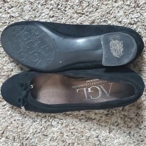 Low block heel. Black suede. Rounded toe with bow detail. Leather lining. Slightly padded footbed. Like new condition.
