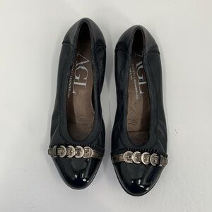 AGL Black leather captoe ballet flat shoe patent spectator women buckle 38.5 7.5