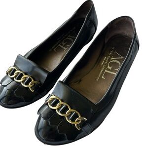 AGL Italy Black Leather Cap Toe Flats Kiltie Fringe Gold Chain Excellent 7.5