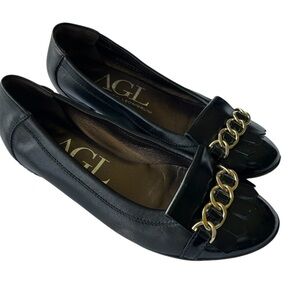These AGL cap toe flats feature a sophisticated design in black leather, highlighted by a striking gold chain detail and kilt fringe across the top. The rounded toe and flat sole ensure comfort and versatility, making them perfect for both casual and elegant occasions. Very minor wear to soles only. Excellent pre owned condition. Size 7.5. Made in Italy